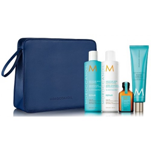 Moroccanoil Luminous Wonders Repair Gift Set. Set in editie limitata include un duo de sampon si balsam de reparare precum si un ulei tratament Moroccanoil in marime de calatorie. Inclus, de asemenea, crema pentru maini Hand Cream Fragrance Originale Moroccanoil, ce hraneste intens mainile, unghiile si cuticulele din colectia de creme de maini. Oferite intr-o geanta practica de cosmetice pentru calatorie.